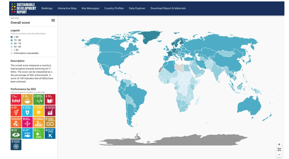 為了評估聯合國193個會員國家在SDG方面的總體進展,SDSN除了發布各國在17項SDG的總體進展排名,也繪製地圖呈現所有國家在各別SDG項目上的得分。