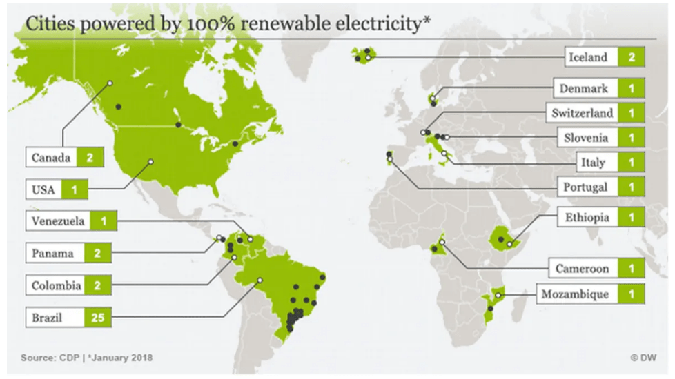 城市是人口聚居之地,高樓林立的都會叢林往往也是溫室氣體排放的重大來源。為了邁向永續發展,近年許多城市已積極承諾使用再生能源並減少碳排放。參考CDP發布的「再生能源城市地圖」可以窺見,目前全球已有超過百座城市的電力七成以上來自再生能源。