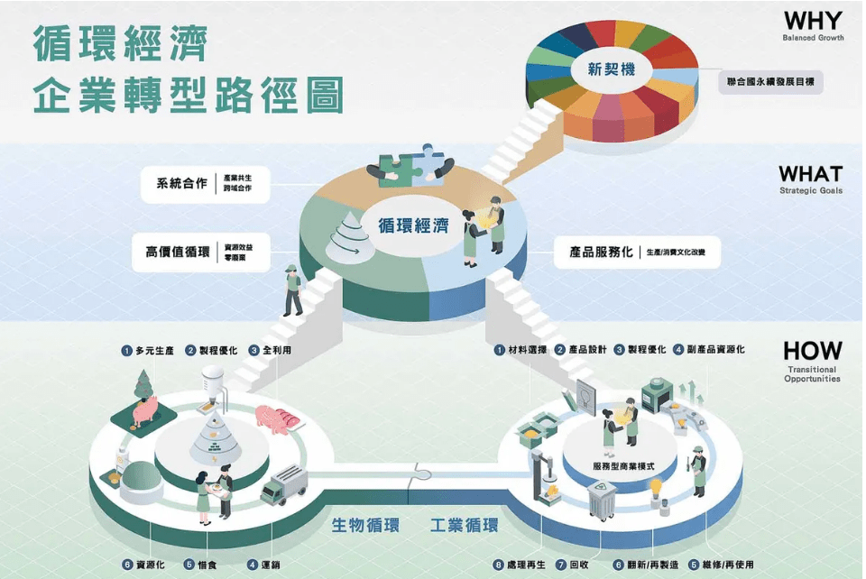 邁向「永續生產與消費」的轉型過程,循環經濟被視為根本性的改革力量。相較於傳統「線性經濟」(Linear Economy)產銷模下式過度消耗有限資源的問題,「循環經濟」(Circular Economy)則期盼建立起資源可恢復、可再生的新型態經濟體系,以促進經濟發展與地球資源的正向循環。(延伸閱讀:邁向2040年台灣的循環經濟 黃育徵:我們需要用知識流取代物質流)