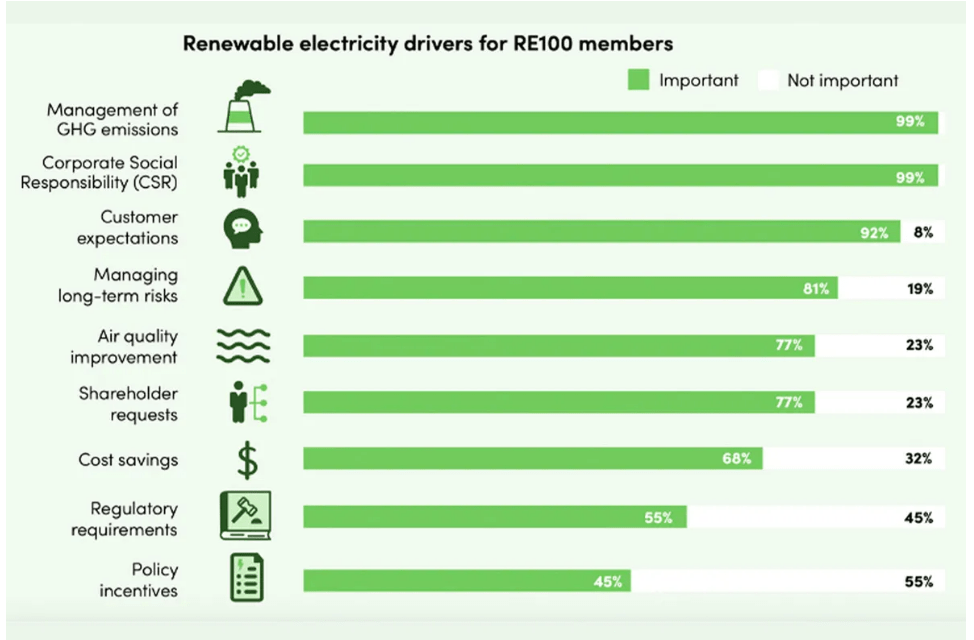 根據RE100最新發佈的2020再生能源市場報告年報「Growing renewable power: companies seizing leadership opportunities」,彙整出企業想要使用百分百綠電的前三大主要動機為:減少溫室氣體排放、履行企業社會責任,以及滿足客戶期待。其他包括:管控長期風險、改善空氣品質、利害關係人要求等也都是促使企業採用綠電的原因。