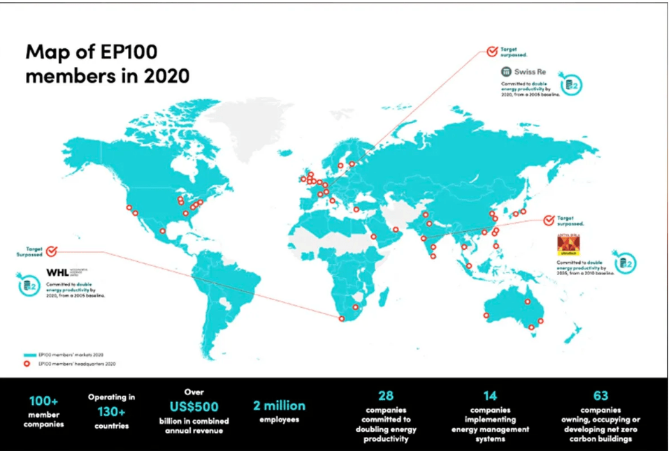 截至目前,EP100計劃已匯集了100多家致力於開展智慧能源的大型公司,總營收超過5000億美元,業務遍及全球130多個市場。其中包括:H&M、Johnson Control等,台灣則有大江生醫、科毅研發加入行列。
