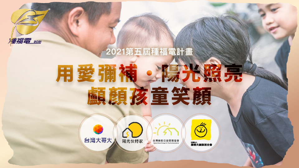 2021第五屆種福電計畫由台灣大哥大、陽光伏特家與台灣綠能公益發展協會共同發起,透過富邦人壽將自有屋頂出租,搭配企業員工、供應商、及大眾捐款,攜手成就本次守護顱顏孩童的創新公益綠電轉供模式。未來,陽光伏特家綠能售電業會將公益綠電轉供予台灣大哥大,所獲得綠電淨收益也將回饋於羅慧夫顱顏基金會,永續照耀顱顏孩童的燦爛未來。