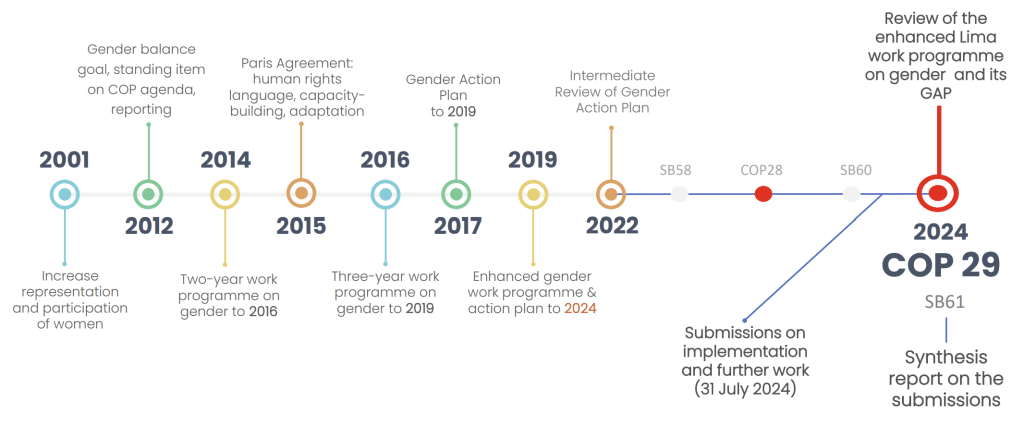 圖1. UNFCCC中的氣候性別議題重要事件發展時序(來源:COP28性別說明會簡報,https://unfccc.int/sites/default/files/resource/Information%20Session%20on%20Gender%20at%20COP%2028.pdf)