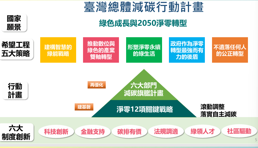 台灣於2022年公布《2050淨零排放路徑》並於2023年完成《氣候變遷因應法》修訂,將2050淨零排放目標入法,展現政府積極減碳的積極雄心。