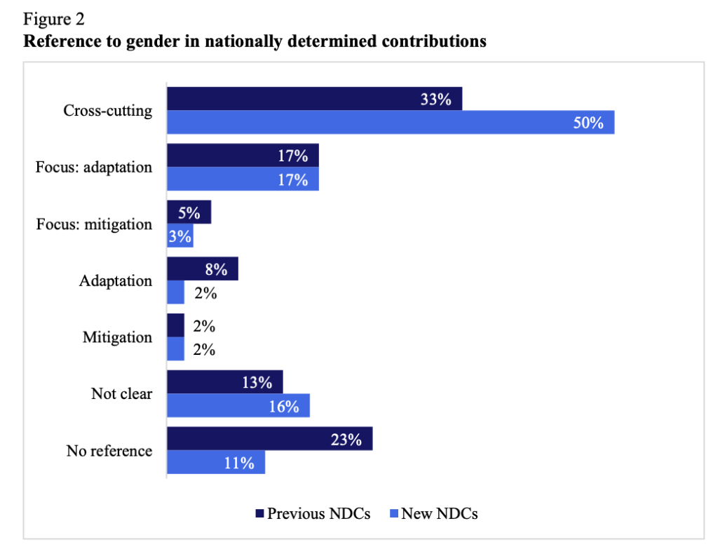 從UNDP於2024年發布的「促進NDC的性別平等」報告可以窺見,NDC 1.0 僅 53 國納入性別平等考量,而在 NDC 2.0 上升到 106 國(96%),顯示各國從繳交 NDC 2.0 開始,已有持續重視氣候治理的性別面向。
