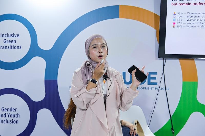 分享她在印尼社區的成果,並認為應重視女性作為家庭能源使用決策者的角色,並提及女性目前在再生能源產業的比例僅有32%等性別失衡的現象。