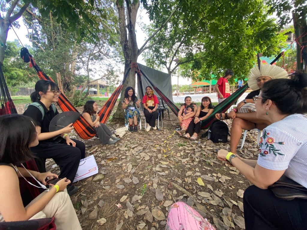 2025年11月14日,台灣綠能公益發展協會上午在藍區帶領永續女子天團練習生完成在COP30藍區官方周邊會議的發表後,永續女子天團旋即前往與 COP30 合作的帕拉聯邦大學,與巴西原住民女性組織 ANMIGA(The National Articulation of Indigenous Women Warriors of Ancestry) 進行深度交流。ANMIGA 是一個橫跨巴西七個生態系(biomes)的原住民女性網絡,她們的文化、治理方式與生態系統的守護密不可分。我們在大樹下乘涼、圍坐討論。那是最有地方寓意的會議室。