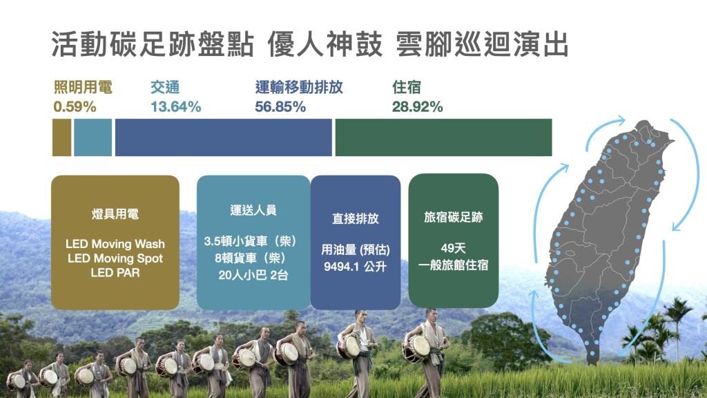 在本次盤點中表演所用燈具照明則以平均使用數量及規格推算;住宿則依據「台灣各類型旅館及民宿二氧化碳排放量之研究(黃育菁,2011)提及,台灣各類型住宿之碳足跡,考慮表演團體人數較多,及各縣市皆以一般旅館較為普遍,故採用一般旅館之中位數6.52kgCO2e計算。