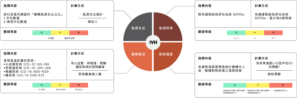 目前能源脆弱度指標包含四大範疇:「能源支出」、「能源效率」、「健康概況」、「熱舒適度」,並可依脆弱等級分為三種燈號(脆弱度低為綠燈、中度為黃燈、高度為紅燈),藉此將社福機構所面臨的能源脆弱度問題面向及程度可視化呈現。